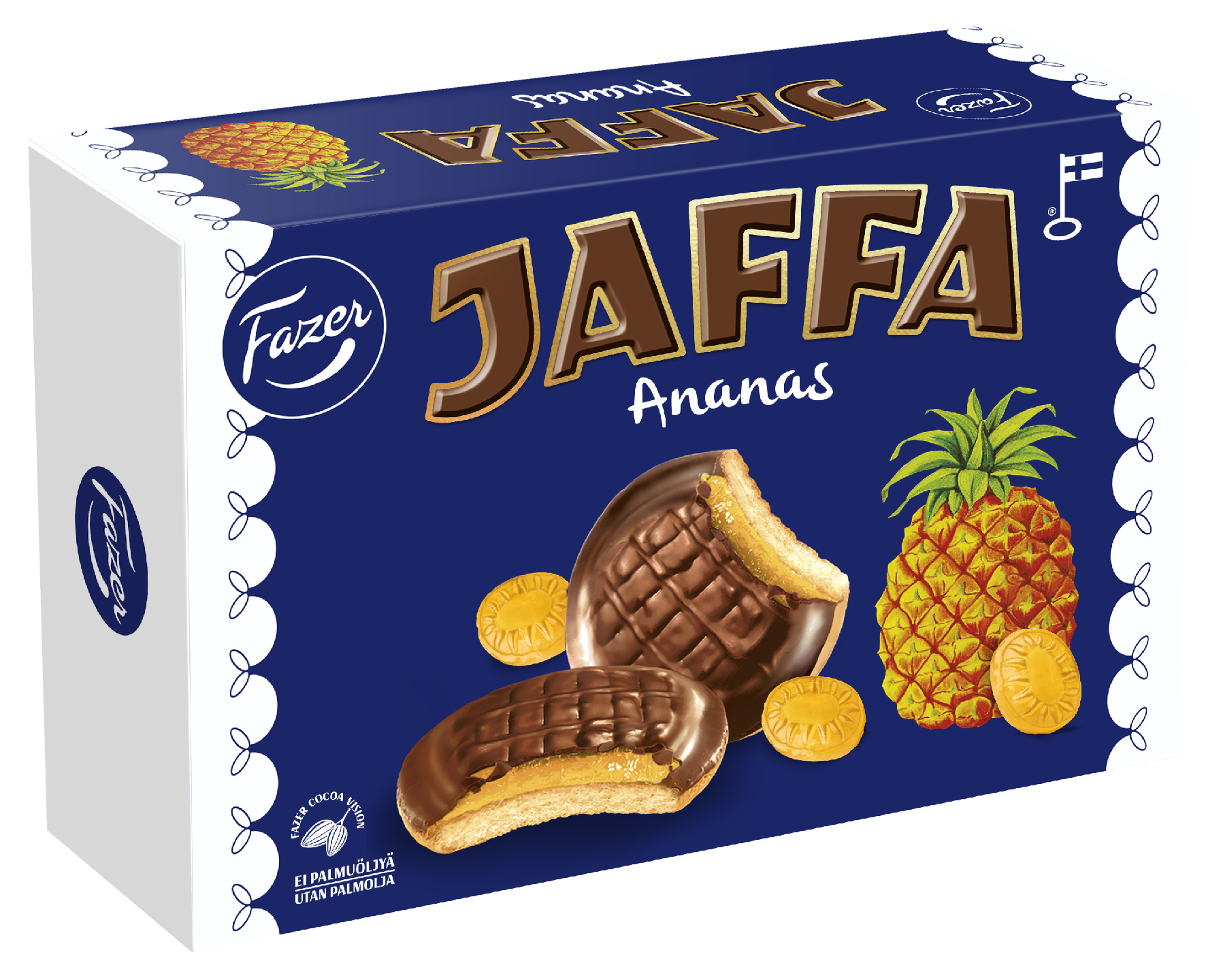 Fazer -keksissä kohtaa kaksi klassikkoa, Jaffa-keksi ja Ananas karkinmakuinen marmeladitäyte. Keksi ei sisällä palmuöljyä. Koko perheen suosikkikeksit maistuvat niin arkena kuin kuin juhlissa.