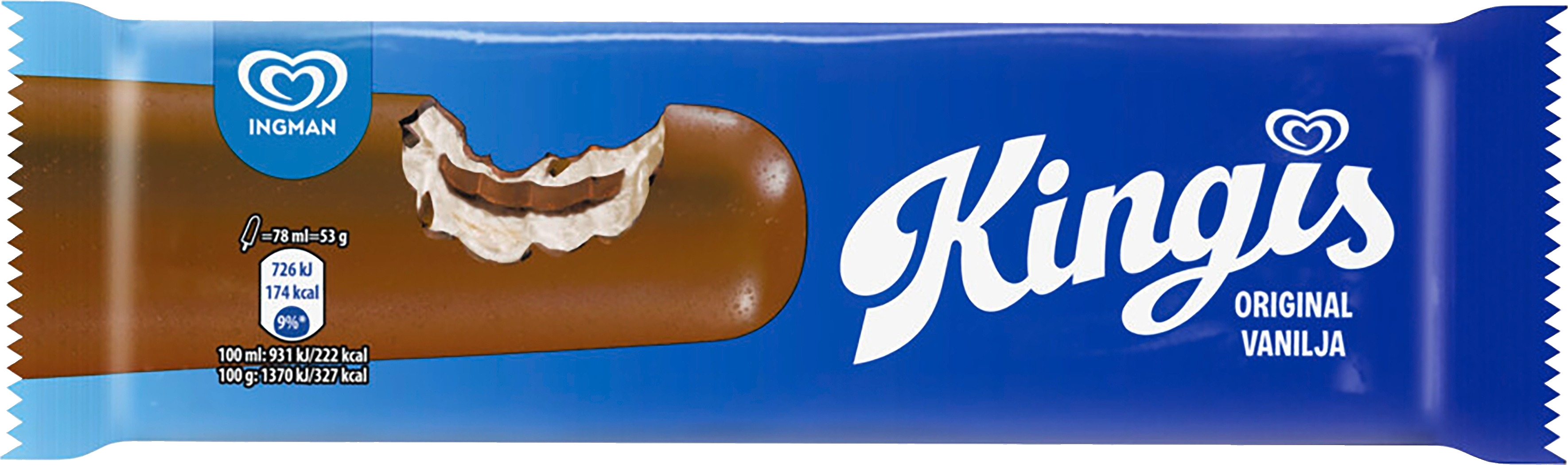 Kingis - suurella sydämellä. Rakastettu klassikkojäätelö Kingis on hurmannut jo yli 40-vuotta suomalaisia jäätelönsyöjiä suurella sydämellä. Kingis Original -jäätelöpuikko on takuuvarma valinta vuodesta toiseen ja lisäksi Kingis -jäätelöiden vaihtuvat uutuusmaut hurmaavat herkullisuudellaan. Puikkojäätelöiden lisäksi Kingis on laajentunut uusiin tuotemuotoihin ja voit nyt herkutella puikkojäätelön lisäksi Kingis-keksijäätelöllä ja jälkiruokajäätelöllä. Kingiksellä on suuri sydän ja pilke silmäkulmassa ja se haluaa kannustaa kaikkia suurisydämisiin tekoihin. Kingis on tehnyt useana vuonna yhteistyötä Pelastakaa Lapset ry:n kanssa ja vuonna 2022 Kingis on yksi Mielinauha -keräyksen pääyhteistyökumppaneista. Saattaa sisältää hasselpähkinää, mantelia ja vehnää.