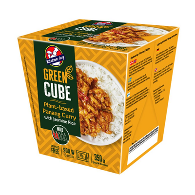 Kitchen Joy Green Cube Panang Thai Cube yhdistää Kitchen Joyn jo legendaksi muodostuneen Panang-kastikkeen maistuvaan soijaproteiiniin muodostaen täydellisen thaimaalaisen thai cube -kasvisaterian. Aterian Panang-kastike on miedosti tulinen (2/5 chiliä) ja sopii näin myös niille, jotka eivät ole poltteen ystäviä mutta arvostavat hyviä makuja. Vain 6 minuuttia mikrossa ja autenttinen makumatka Thaimaahan voi alkaa! Löydät Kitchen Joy thai cuben pakastealtaasta.