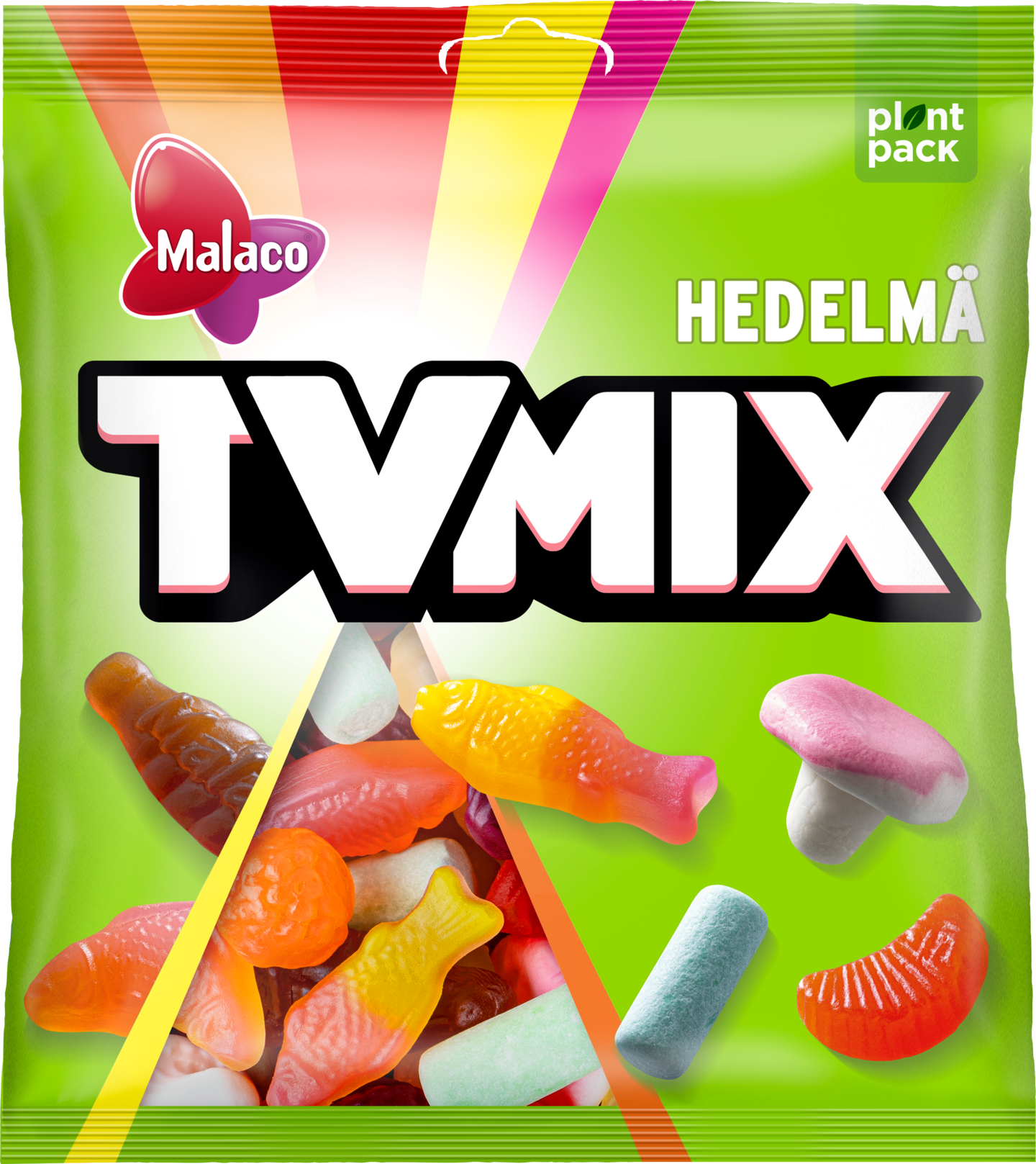 TV Mix Hedelmä on herkullisen monipuolinen sekoitus hedelmäistä viinikumia, vaahtoa ja rapeaa lakritsia, jotka tarjoavat makuelämyksiä moneen makuun. Raikkaan ja värikkään lisän sekoitukseen tuo uutuuskarkki monivärinen viinikumikala! Reilun kokoinen pussi sopii erinomaisesti jaettavaksi yhteisiin herkutteluhetkiin perheen tai ystävien kesken. Miks? Miksei. Karkit on pakattu pussiin, joka on valmistettu 50 % kasvipohjaisesta muovista. Lisätietoja cloetta.com/plantpack
