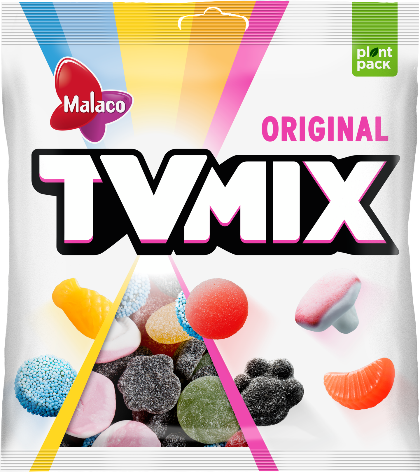 Parhaat on sekaisin! TV MIX Original -pussista löytyy monipuolinen sekoitus viinikumimakeisia, vaahtokarkkeja, liitulakuja, nonparellikarkkeja ja salmiakkia. Pussi oli markkinoiden ensimmäisiä sekoituspusseja, kun se tuli myyntiin vuonna 1989 - todellinen karkkisekoitusklassikko siis. Karkit on pakattu pussiin, joka on valmistettu 50 % kasvipohjaisesta muovista. Lisätietoja cloetta.com/plantpack