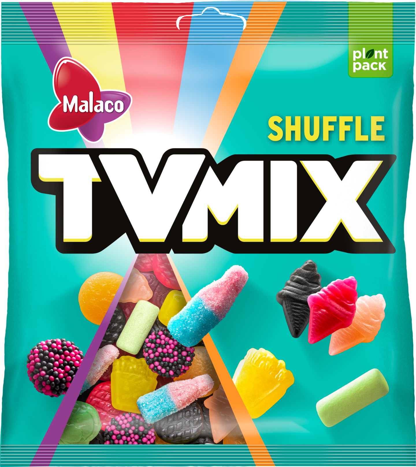 Parhaat on sekaisin! TV MIX Shuffle -pussista löydät monipuolisen sekoituksen makuja, rakenteita, hauskoja muotoja sekä irtokarkkihyllyn suosikkeja: makeaa, kirpeää, rapeaa ja rouskuvaa! Reilun kokoisesta pussista riittää jaettavaksi ystävien tai perheen kesken. Karkit on pakattu pussiin, joka on valmistettu 50 % kasvipohjaisesta muovista. Lisätietoja cloetta.com/plantpack