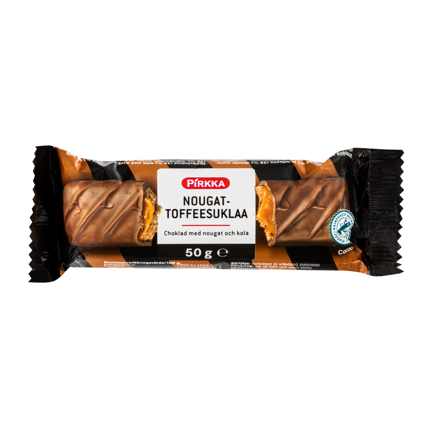 Pirkka nougat-toffee-suklaapatukka on maitosuklaalla kuorrutettu suklaapatukka, jossa on herkullinen yhdistelmä pehmeää nougatia ja toffeeta. Suklaan valmistuksessa käytetty kaakao on Rainforest Alliance- sertifioitua.