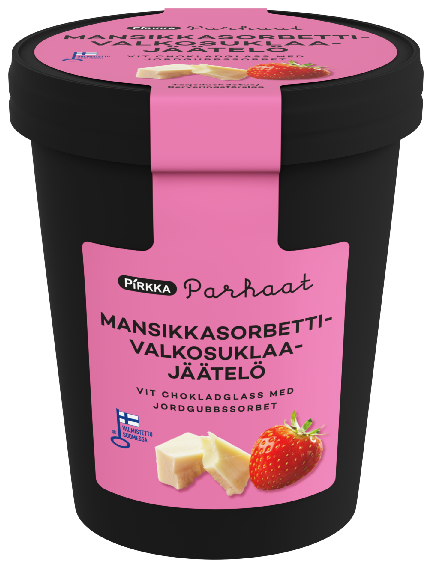 Raikas mansikkasorbetti yhdistyy pehmeään valkosuklaajäätelöön ja rapeisiin valkosuklaapaloihin – vastustamaton herkkuhetki joka lusikallisella. Valmistettu Suomessa. Avainlipputuote.