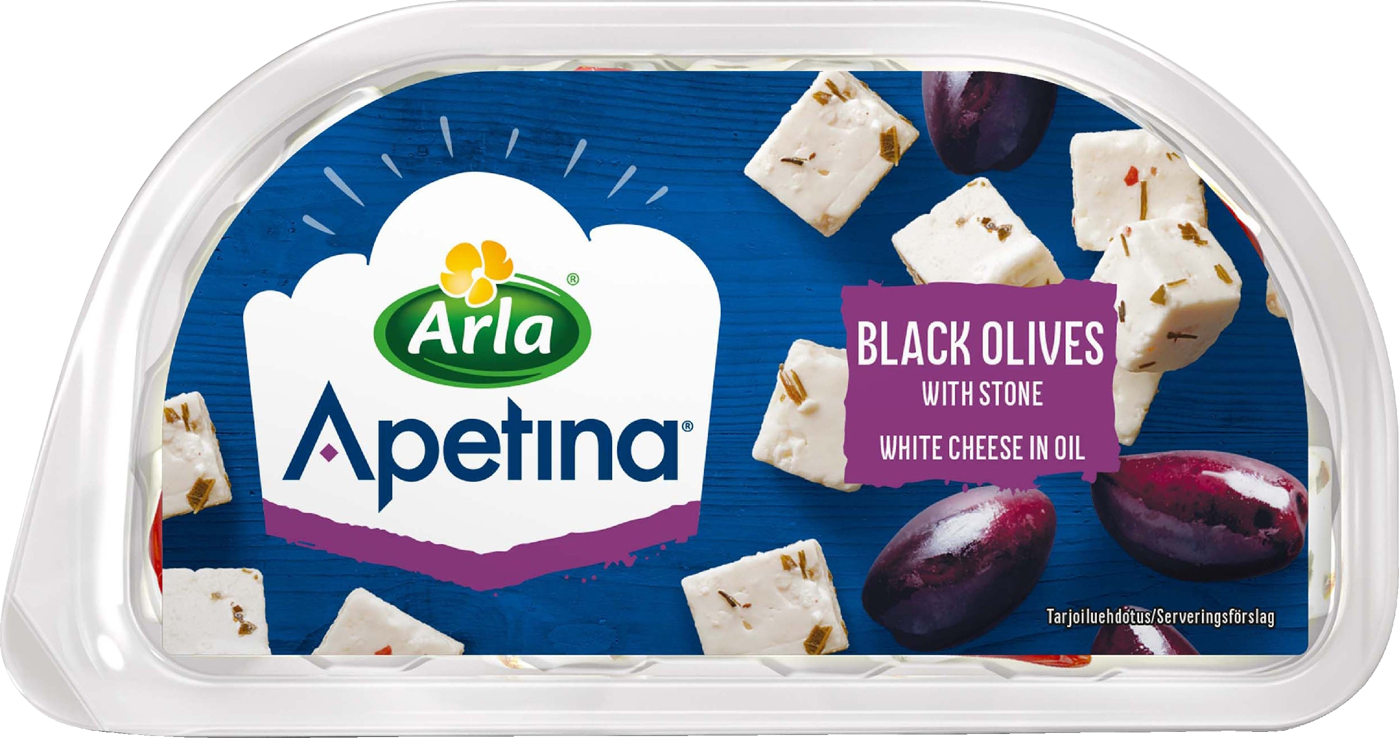 Arla Apetina 100/60g snack välimerellinen juusto kuutioina ja mustia oliiveja ölymarinadissa.