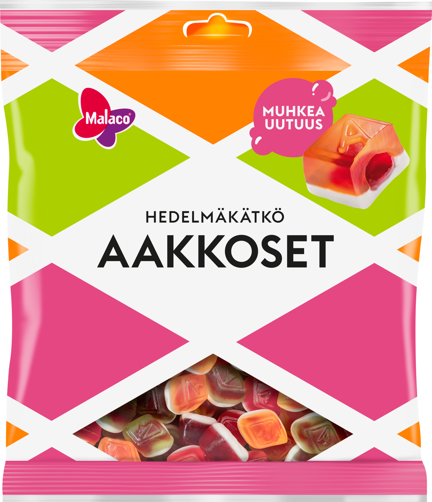 Aakkoset Hedelmäkätkö sisältää pehmeitä ja muhkeita täytekarkkeja vadelman, appelsiinin ja limen makuisena. Pehmeän pureskeltava hedelmäkarkkikuori ja vaahtokarkkipohja kätkevät sisälleen yllätyksen: erivärisen ja -makuisen sydämen. Reilusta pussikoosta riittää jaettavaksi tai useampaan herkutteluhetkeen. Aakkoset – Kirjaimellisesti hyvää