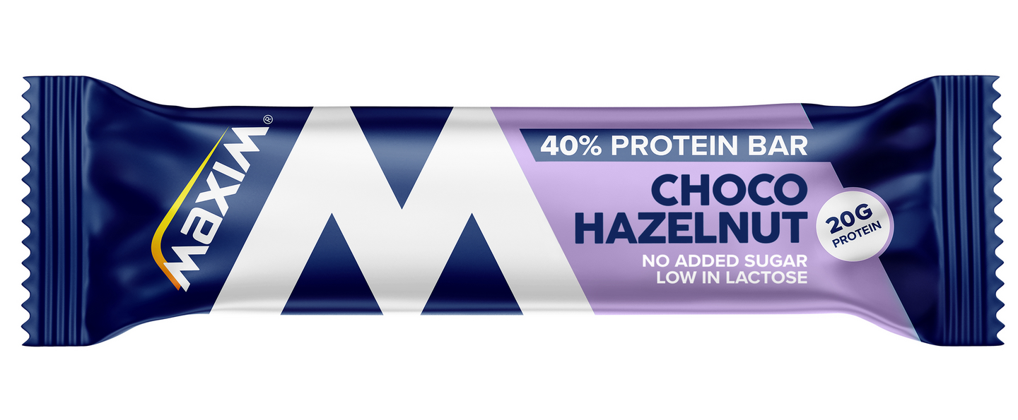 Maxim Choco Hazelnut 40% -proteiinipatukka sisältää 20 g proteiinia. Herkullinen suklaan- ja hasselpähkinän makuinen patukka on päällystetty rapealla suklaakuorrutteella. Choco Hazelnut -patukka on täydellinen nautittavaksi ennen treeniä ja heti kovan treenin jälkeen, jolloin keho tarvitsee proteiinia. Sopii nautittavaksi myös välipalana aterioiden välillä. Tuotteessa on vähän sokeria ja runsaasti kuitua. Vähälaktoosinen. Tuotteissa käytetty kaakao on Rainforest Alliance -sertifioitu. Ei sisällä palmuöljyä. Osana tasapainoista ja monipuolista ruokavaliota ja terveitä elämäntapoja.