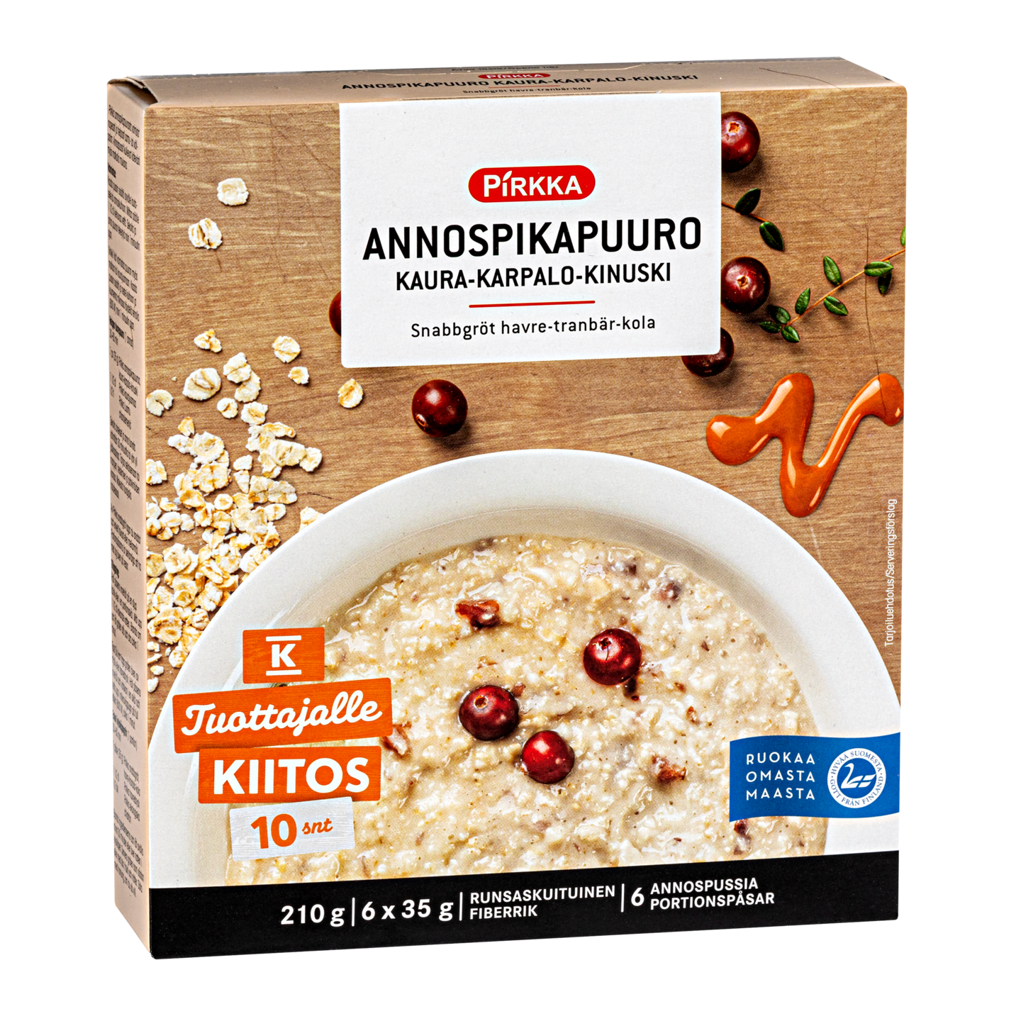 Pirkka annospikapuuro kaura-karpalo-kinuskista valmistat helposti ja nopeasti maittavaa puuroa. Annospussit kulkevat kätevästi mukana ja valmistukseen tarvitaan vain kiehuvaa vettä. Puuron voi nauttia myös tuorepuurona ja käyttää valmistukseen veden sijasta esimerkiksi rahkaa tai jogurttia. Puuro sisältää runsaskuituista suomalaista täysjyväkauraa ja se on maustettu karpalon ja kinuskin makuiseksi. Tuotteella on Hyvää Suomesta- ja Tuottajalle Kiitos -merkki ja sen valmistaa Helsingin Mylly Järvenpäässä.