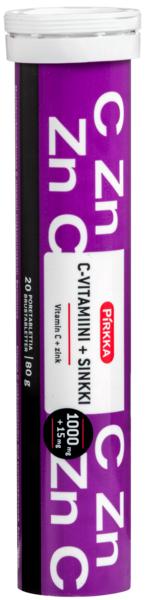 Pirkka C-vitamiini + sinkkiporetabletti on mustaherukanmakuinen C-vitamiini-sinkkiporetabletti. 1 poretabletti sisältää 1000 mg C-vitamiinia ja 15 mg sinkkiä . C-vitamiini ja sinkki edistävät immuunijärjestelmän normaalia toimintaa. Suositeltava vuorokausiannos aikuisille: 1 poretabletti päivässä, liuotetaan lasilliseen vettä. Ravintolisä ei korvaa monipuolista ja tasapainoista ruokavaliota eikä terveitä elämäntapoja. Tuote on laktoositon, gluteeniton ja soveltuu vegaaniseen ruokavalioon.