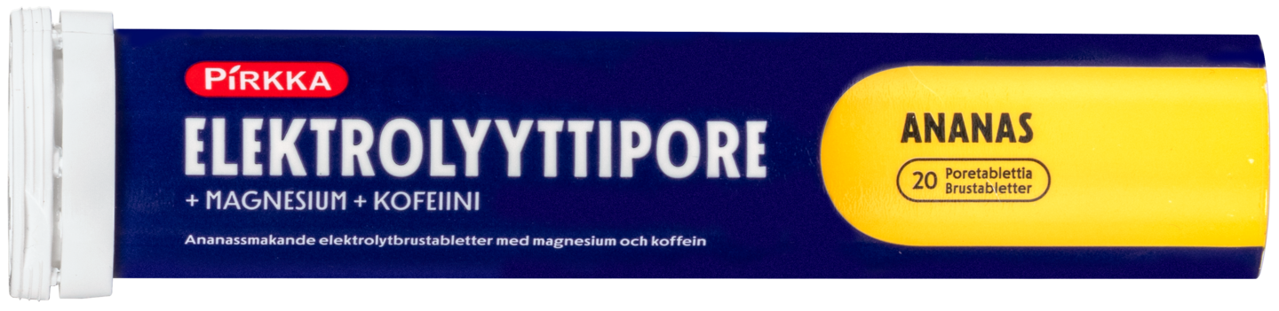 Raikkaan ananaksenmakuinen Pirkka elektrolyyttipore ananas on sokereita, kivennäisaineita, magnesiumia ja kofeiinia sisältävä poretabletti neste- ja elektrolyyttitasapainon ylläpitoon. Sisältää keholle tärkeitä kivennäisaineita ja elektrolyyttejä nopeasti imeytyvässä muodossa. Valmista juoma tipauttamalla poretabletti kylmään veteen juomalasiin tai juomapulloon. Sopii erityisen hyvin nautittavaksi runsaan hikoilun jälkeen kuten urheilun, saunan, kuuman kesäpäivän tai flunssan jälkeen. Ravintolisä. Laktoositon. Gluteeniton. Vegaaninen.