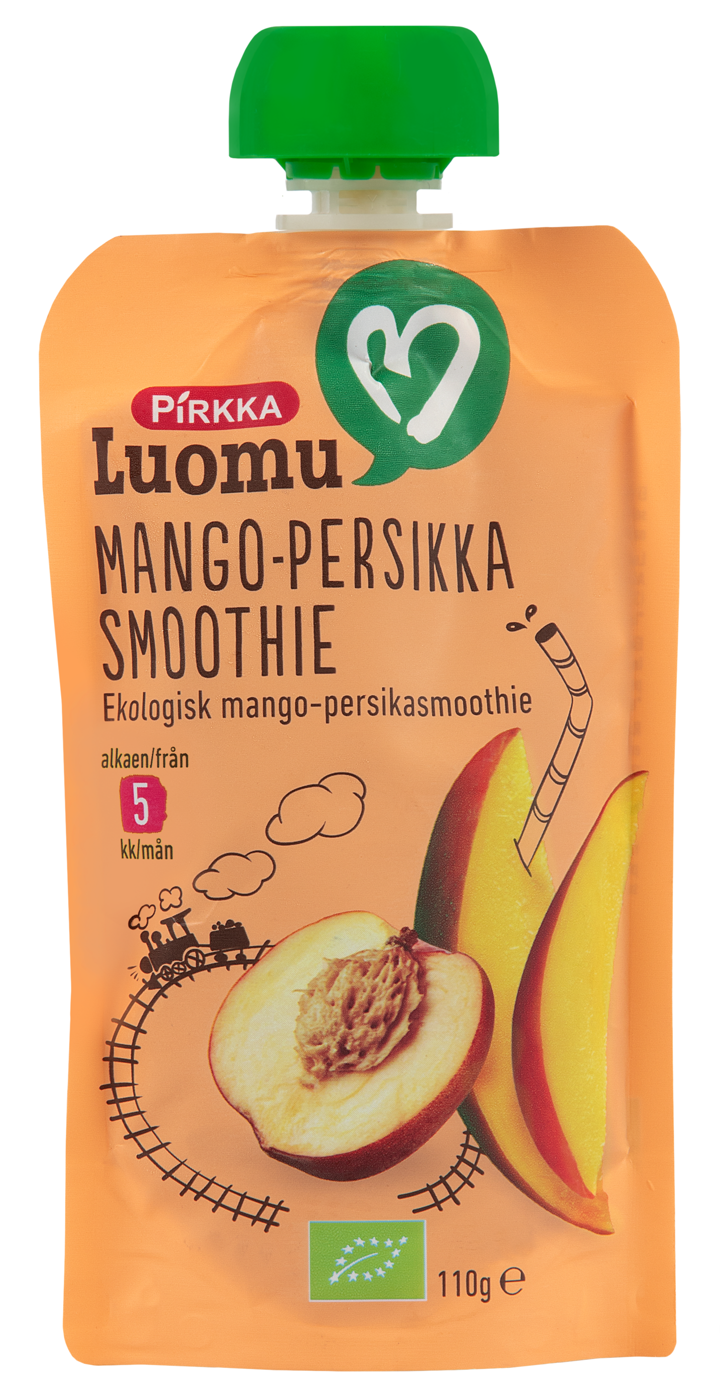 Pirkka Luomu mango-persikka smoothie sopii perheen pienimmille heti 5 kk alkaen. Vain luonnonmukaisesti viljeltyä mangoa, persikkaa ja omenaa sisältävä smoothie on maittava välipala, joka ei sisällä lisättyä sokeria eikä viljaa. Tuote on pakattu kevyeen korkilliseen pussipakkaukseen, joka säilyy huoneenlämmössä. Käytön jälkeen pakkaus voidaan kierrättää muovinkeräykseen. Kokeile myös muita maistuvia Pirkka Luomu lasten smoothieita!