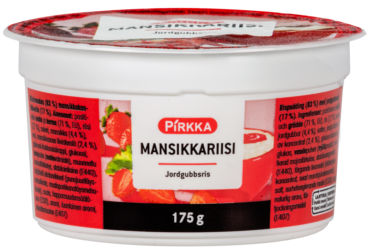 Pirkka mansikkariisi on täyteläinen ja maistuva riisivanukas. Sopii hyvin välipalaksi tai jälkiruoaksi.