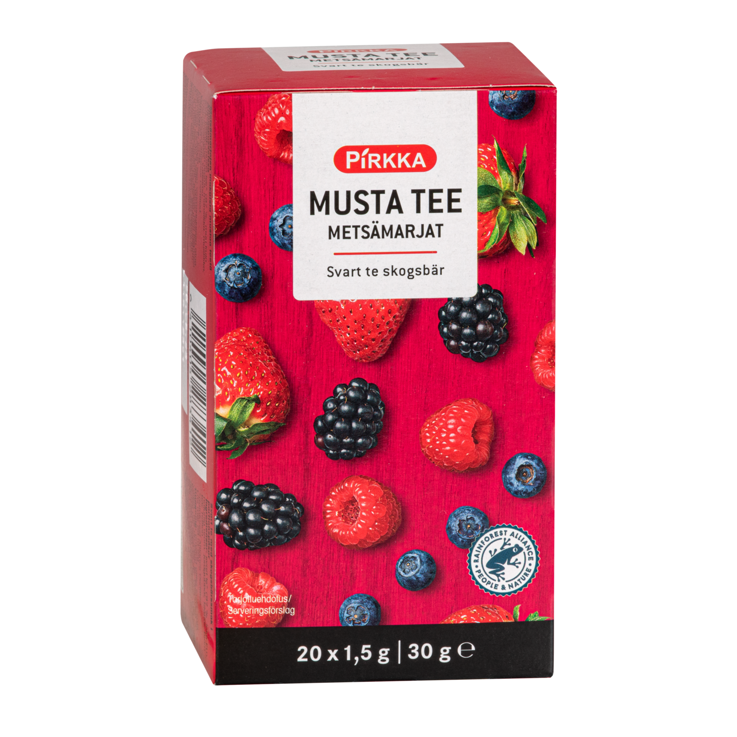 Pirkka musta tee metsämarja on metsämarjojen makuista mustaa teetä annospusseihin pakattuna. Hauduta tee kupissa tai lämmitetyssä teekannussa haluttuun vahvuuteen. Tarjoa sellaisenaan tai esimerkiksi hunajan kanssa. Kokeile myös kylmäuutettuna juomana. Pakkauksessa on 20 annospussia. Pirkka musta tee metsamarjat on Rainforest Alliance -sertifioitua.