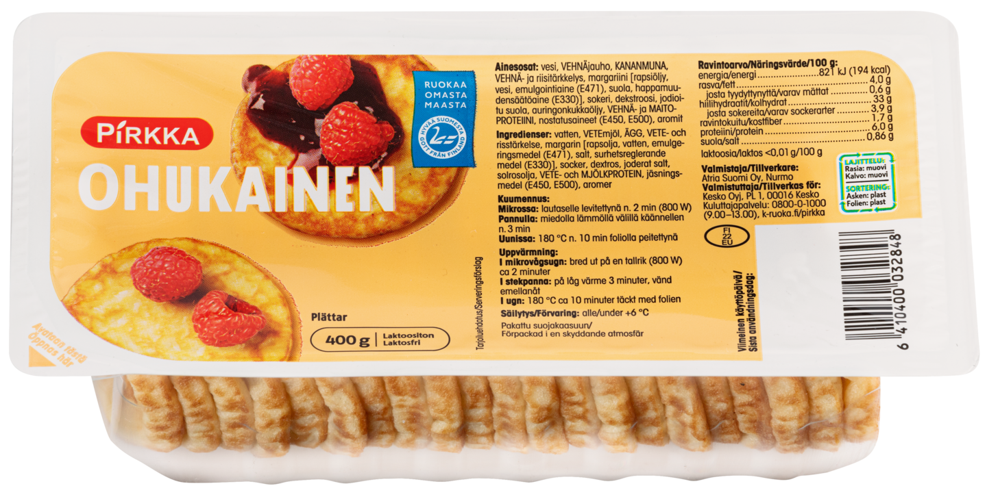 Ohukaiset sopivat sellaisenaan makeiden hillojen tai suolaisten lisäkkeiden kanssa. Ohukaiset maistuvat perinteiseen tapaan hillon ja kermavaahdon kanssa. Tuote on vähälaktoosinen ja valmistettu Suomessa.