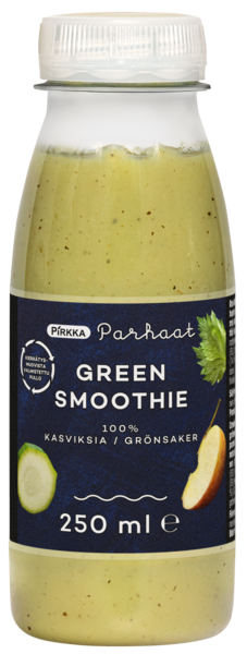Pirkka Parhaat smoothie on raikkaan hedelmäinen juotava aamu- tai välipala. Smoothie sisältää 100% hedelmää ja kasviksia, eikä siihen ole lisätty sokeria. Smoothiessa maistuvat mm. omena, banaani ja kesäkurpitsa. Smoothie on pakattu pantillisiin muovipulloihin.
