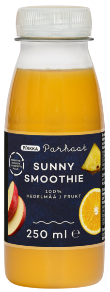 Pirkka Parhaat smoothie on raikkaan hedelmäinen juotava aamu- tai välipala. Smoothie sisältää 100% hedelmää, eikä siihen ole lisätty sokeria. Tässä aurinkoisessa smoothiessa maistuvat muun muassa ananas, appelsiini ja passionhedelmä. Smoothiet on pakattu pantillisiin muovipulloihin.