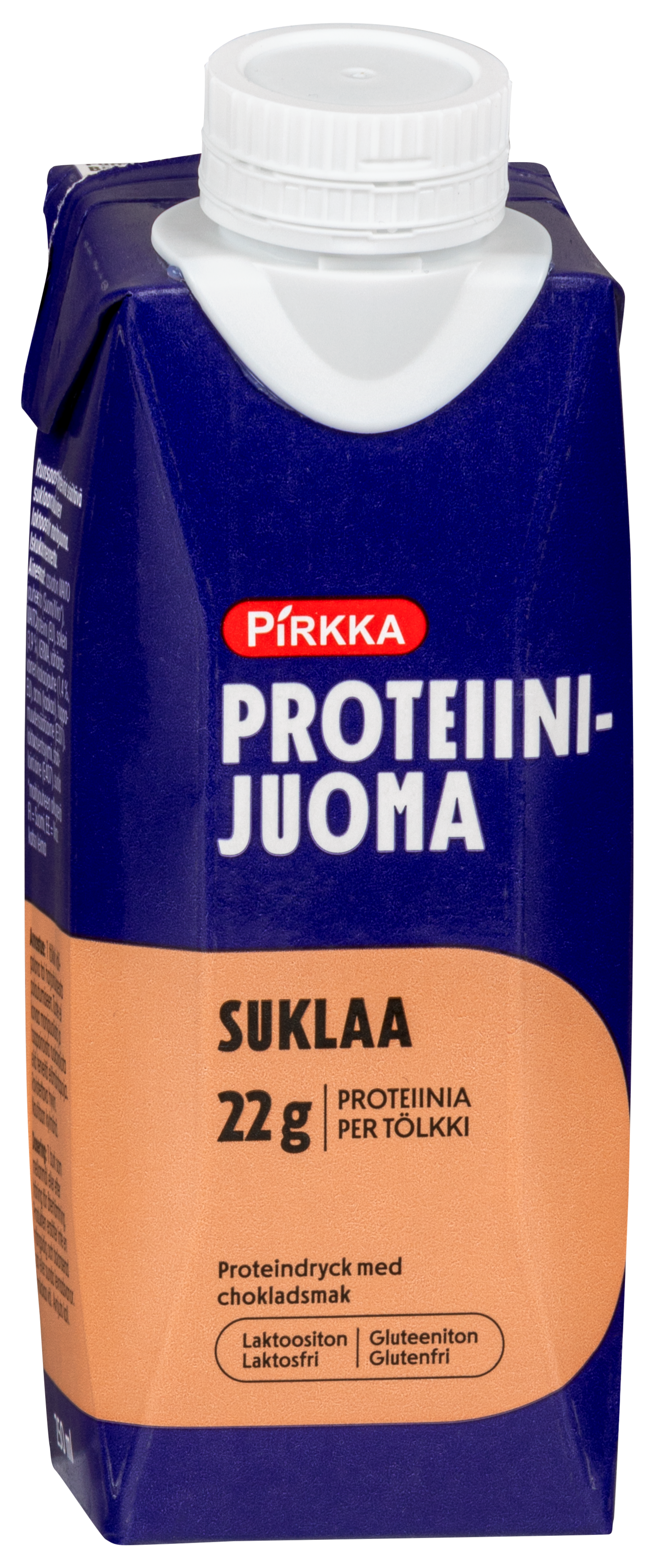Pirkka proteiinijuoma suklaa on runsaasti proteiinia sisältävä suklaanmakuinen, laktoositon maitojuoma. Yksi tölkki (250 ml) sisältää 22 g proteiinia. Pirkka proteiinijuoma suklaa sopii nautittavaksi välipalajuomana päivän mittaan tai treenin jälkeen palautumiseen. Tuote on iskukuumennettu, joten se säilyy kätevästi huoneenlämmössä ja on helppo napata mukaan. Pirkka proteiinijuoma suklaa valmistetaan Kouvolassa.