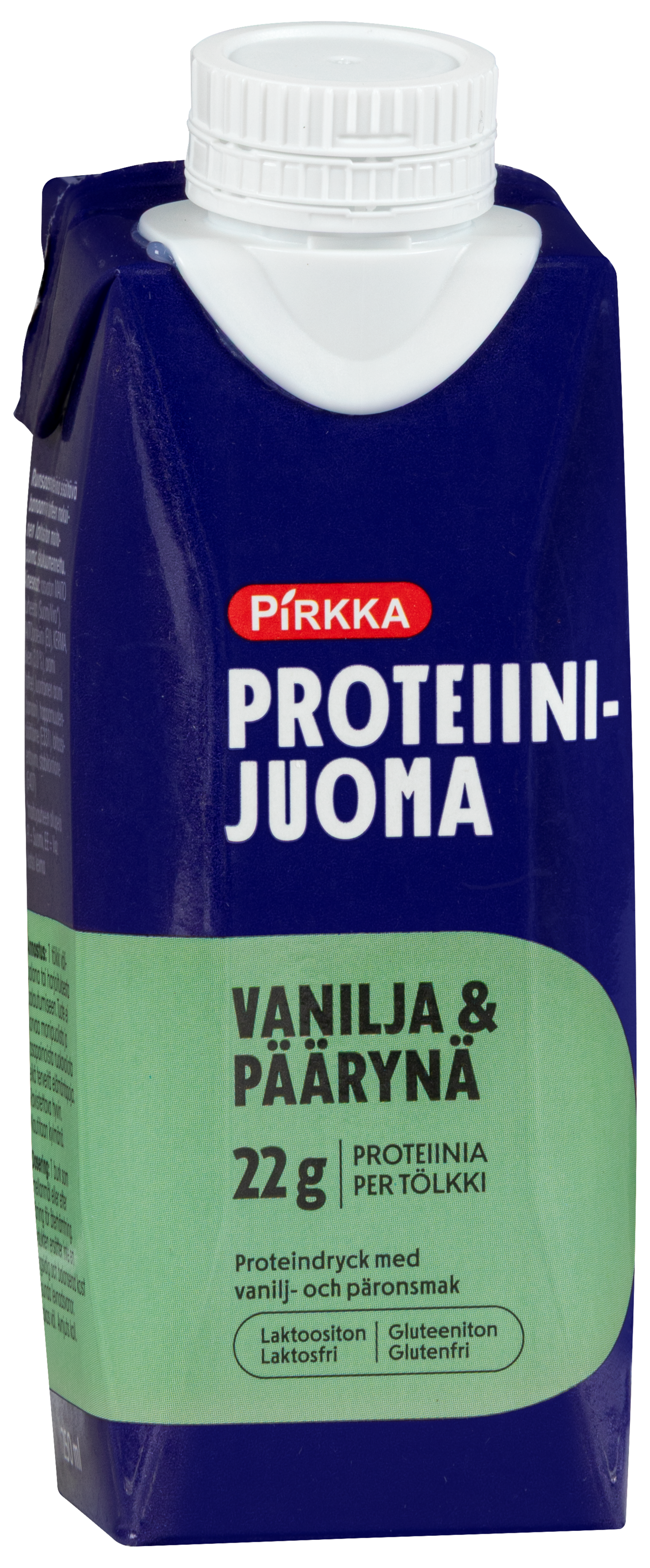 Pirkka proteiinijuoma vanilja & päärynä on runsaasti proteiinia sisältävä vaniljan ja päärynänmakuinen, laktoositon maitojuoma. Yksi tölkki (250 ml) sisältää 22 g proteiinia. Proteiinijuoma sopii nautittavaksi välipalajuomana päivän mittaan tai treenin jälkeen palautumiseen. Tuote on iskukuumennettu, joten se säilyy kätevästi huoneenlämmössä ja on helppo napata mukaan. Pirkka proteiinijuoma vanilja & päärynä valmistetaan Kouvolassa.