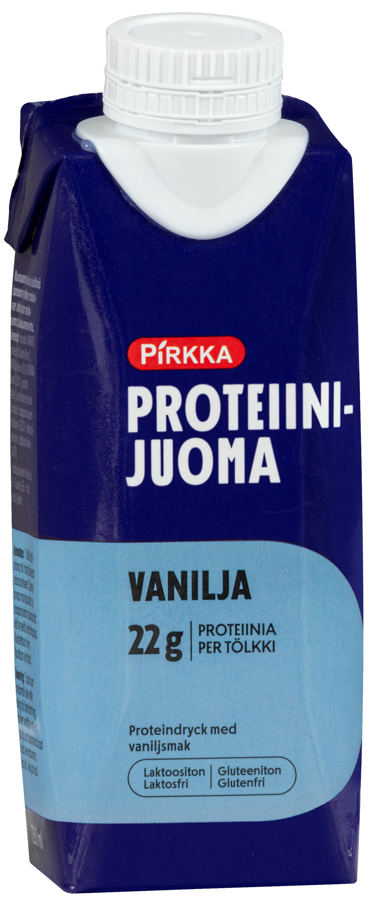 Pirkka proteiinijuoma vanilja on runsaasti proteiinia sisältävä vaniljanmakuinen, laktoositon maitojuoma. Yksi tölkki (250 ml) sisältää 22 g proteiinia. Pirkka proteiinijuoma vanilja sopii nautittavaksi välipalajuomana päivän mittaan tai treenin jälkeen palautumiseen. Tuote on iskukuumennettu, joten se säilyy kätevästi huoneenlämmössä ja on helppo napata mukaan. Pirkka proteiinijuoma vanilja valmistetaan Kouvolassa.