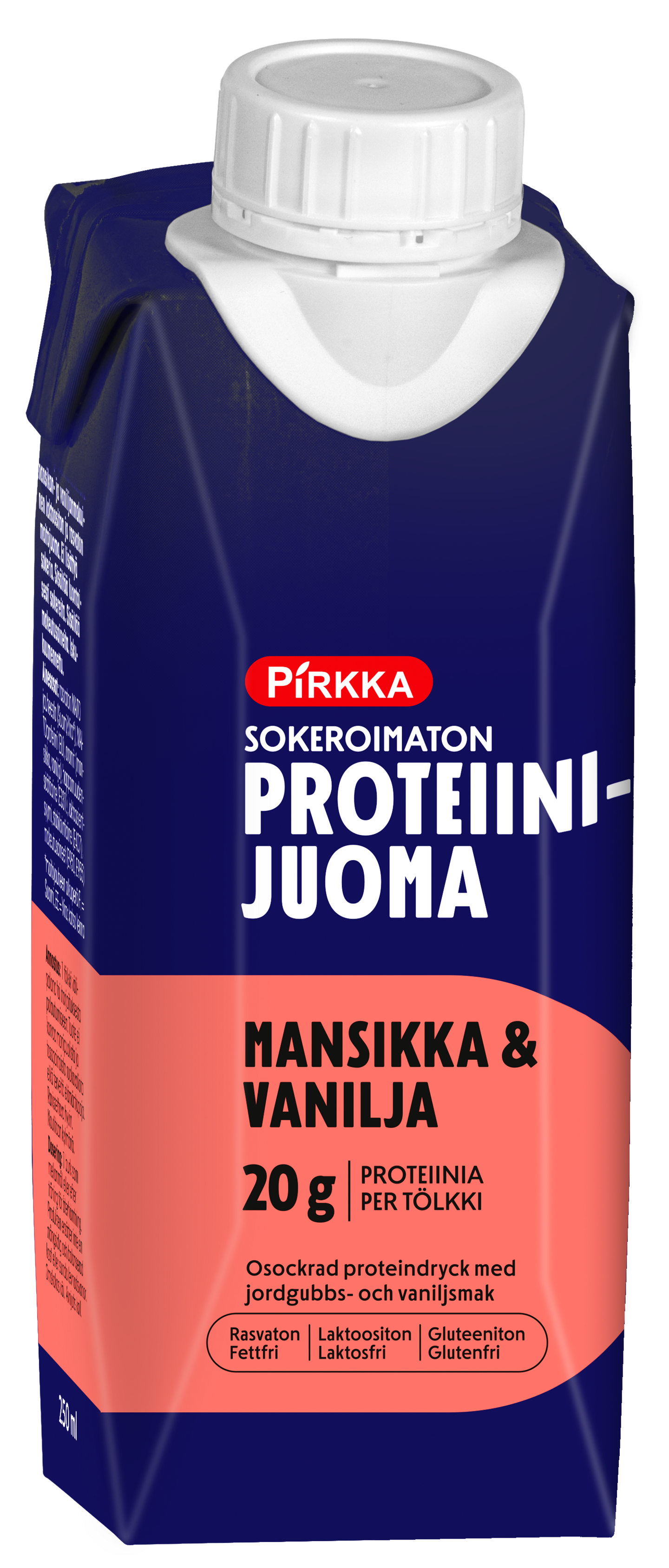 Pirkka proteiinijuoma mansikka & vanilja on sokeroimaton runsaasti proteiinia sisältävä mansikan ja vaniljan makuinen, rasvaton ja laktoositon maitojuoma. Yksi tölkki (250 ml) sisältää 20 g proteiinia. Pirkka proteiinijuoma mansikka & vanilja sopii nautittavaksi välipalajuomana päivän mittaan tai treenin jälkeen palautumiseen. Tuote on iskukuumennettu, joten se säilyy kätevästi huoneenlämmössä ja on helppo ottaa mukaan. Pirkka proteiinijuoma mansikka & vanilja valmistetaan Kouvolassa.