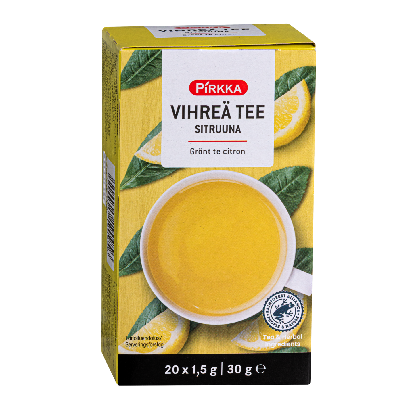 Pirkka vihreä tee sitruuna on sitruunankuorella ja aromilla maustettu tee annospusseihin pakattuna. Toisin kuin musta tee, vihreää teetä ei hapeteta, jolloin sen väri säilyy. Vihreä tee myös sisältää vähemmän kofeiinia kuin musta tee. Valmistettu Rainforest Alliance -sertifioidusta teestä.
