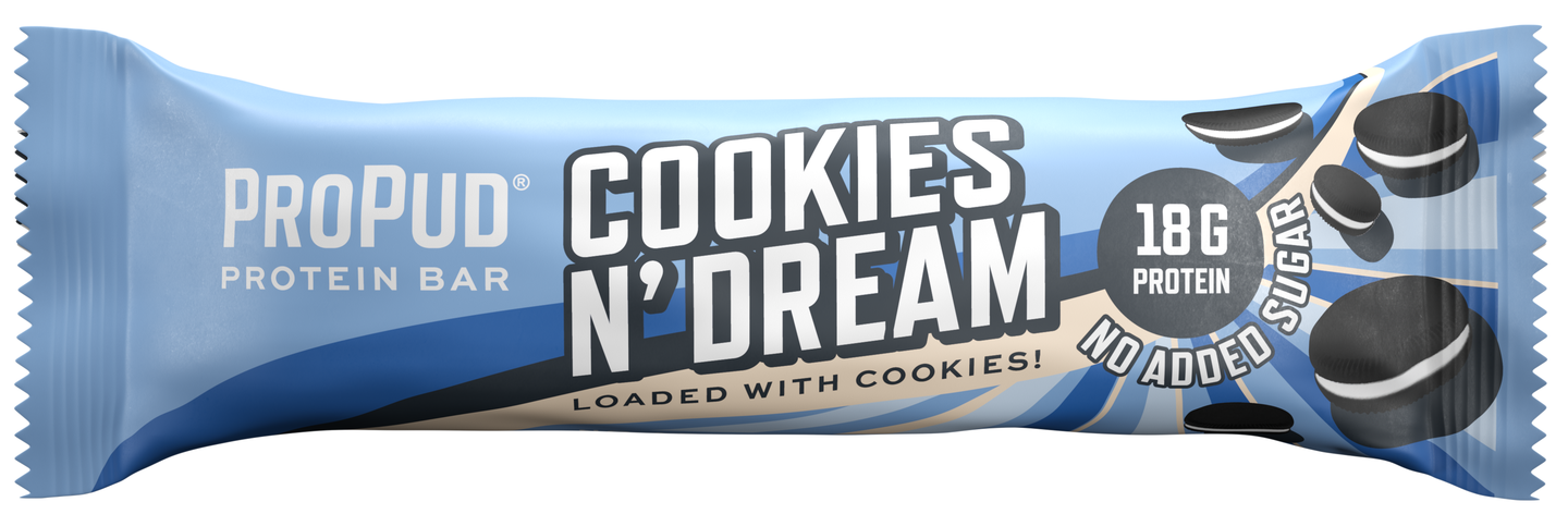 ProPud Protein Bar Cookies n´ Dream - suklaakeksin- ja kermanmakuinen proteiinipatukka päällystettynä suklaakeksin paloilla sekä valkosuklaakuorrutteella . Ei lisättyä sokeria ja 18 g proteiinia per patukka. Ei sisällä palmuöljyä.