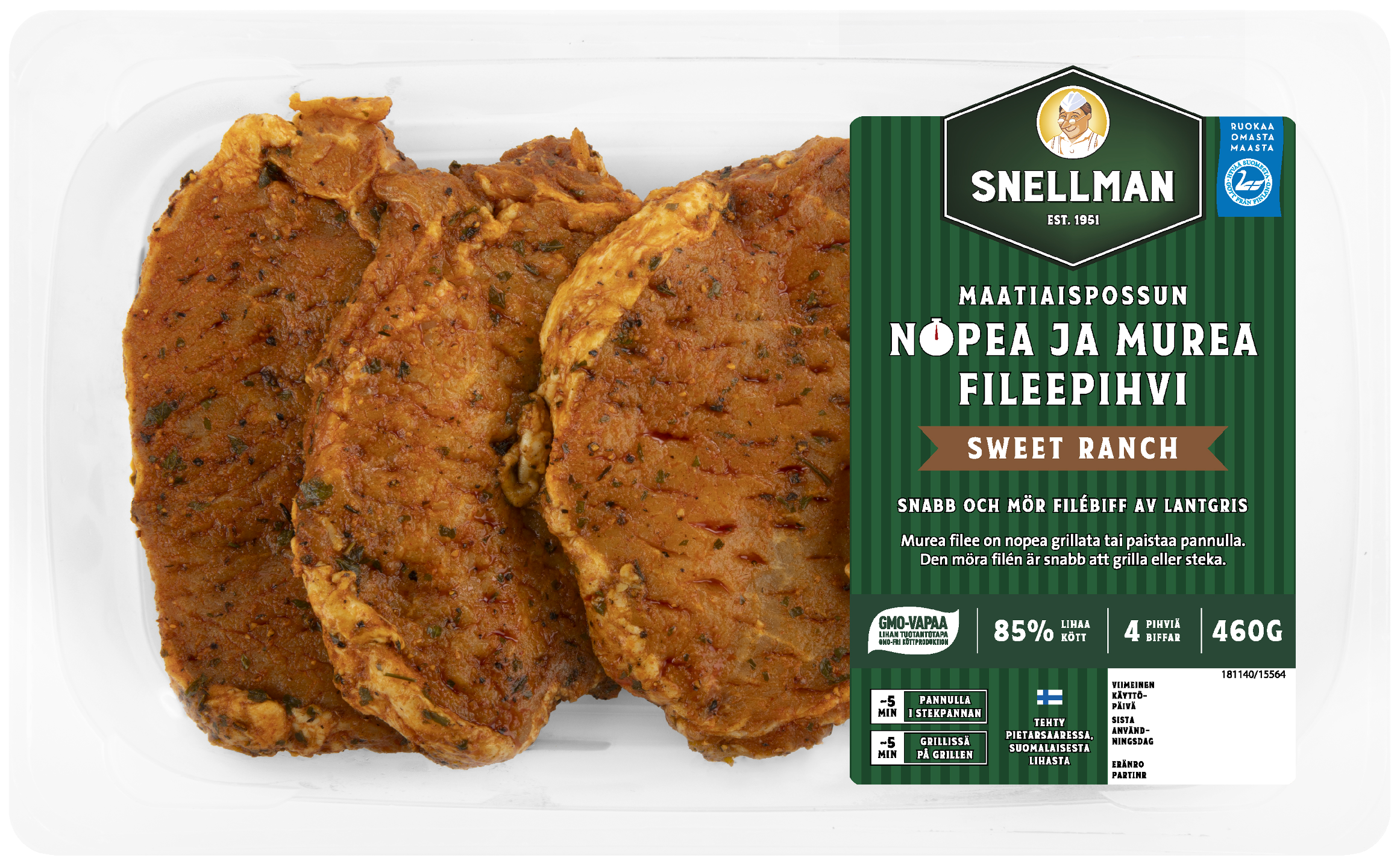 Maatiaispossun nopeat ja mureat fileepihvit sopivat täydellisesti grilliin ja pannulle. Marinadia on juuri sopivasti, makua reilusti ja valmiiksi mureutetut ja maustetut pihvit pysyvät mehevinä ja mureina paistettaessa. Ihanan täyteläinen Sweet Ranch fileepihvi saa makua sipulista, kuivatusta tomaatista, paprikasta, ja valkosipulista. Kotimaista GMO-vapaata maatiaispossun ulkofileetä perhetiloilta. Näillä on helppo onnistua!