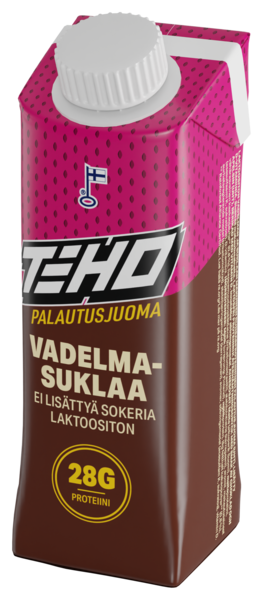 TEHO palautusjuomat on valmistettu suomalaiseen laktoosittomaan lähimaitopohjaan. Tuotteet on jaettu käyttöyhteyden perusteella kahteen konseptiin: voima- ja kestävyysharjoitteluun. TEHO Vadelma-suklaa palautusjuoma on tarkoitettu voimaharjoittelusta palautumiseen tai välipalaksi. TEHO Vadelma-suklaa ei sisällä lisättyä sokeria, ainoastaan maidossa luonnollisesti olevan määrän. Tuote on runsasproteiininen, yksi pakkaus sisältää 28 g proteiinia ja vain 4,9 g/dl hiilihydraatteja. Tuote on makeutettu makeutusaineilla, mutta ilman aspartaamia.