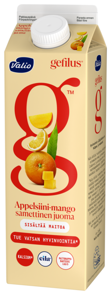 Tue vatsan hyvinvointia! Valio Gefilus® samettinen appelsiini-mango on lempeän raikas koko perheen juoma. Hedelmäisen juoman makua pehmentää sen sisältämä maito. Tuote sisältää runsaasti kalsiumia, joka edistää ruoansulatusentsyymien normaalia toimintaa. Tuote sisältää myös runsaasti C- ja D-vitamiineja, jotka edistävät luontaisen puolustusjärjestelmän normaalia toimintaa. Nauti osana tasapainoista ja monipuolista ruokavaliota ja terveitä elämäntapoja. Mukana myös LGG® maitohappobakteeri.