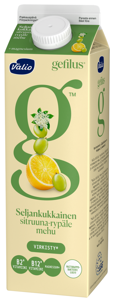 Virkisty raikkaasti! Valio Gefilus® seljankukkainen sitruuna-rypälemehu +magnesium on tasapainoinen yhdistelmä makeutta ja kirpeyttä. Tuote sisältää runsaasti magnesiumia, riboflaviinia (B2), B12-vitamiinia ja C-vitamiinia, jotka auttavat vähentämään väsymystä ja uupumusta. Tuote sisältää myös runsaasti D-vitamiinia, joka edistää luontaisen puolustusjärjestelmän normaalia toimintaa. Nauti osana tasapainoista ja monipuolista ruokavaliota ja terveitä elämäntapoja. Sisältää myös LGG® maitohappobakteeria.