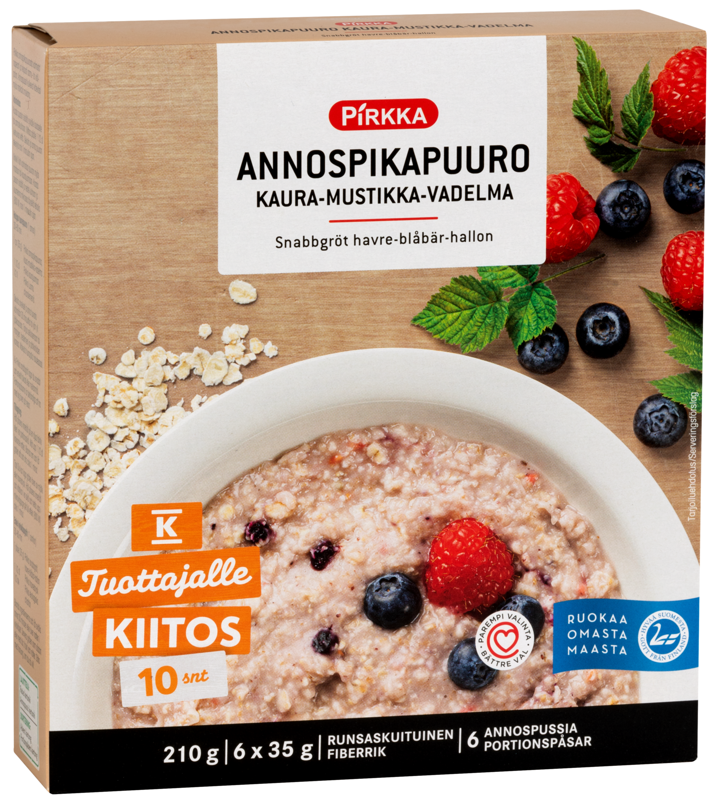 Pirkka annospikapuurosta valmistat helposti ja nopeasti maittavaa puuroa. Annospussit kulkevat kätevästi mukana ja valmistukseen tarvitaan vain kiehuvaa vettä. Puuron voi nauttia myös tuorepuurona ja käyttää valmistukseen veden sijasta esimerkiksi rahkaa tai jogurttia. Puuro sisältää runsaskuituista suomalaista täysjyväkauraa ja siinä maistuvat myös mustikka ja vadelma. Tuotteella on Hyvää Suomesta- ja Tuottajalle Kiitos -merkki ja sen valmistaa Helsingin Mylly Järvenpäässä.